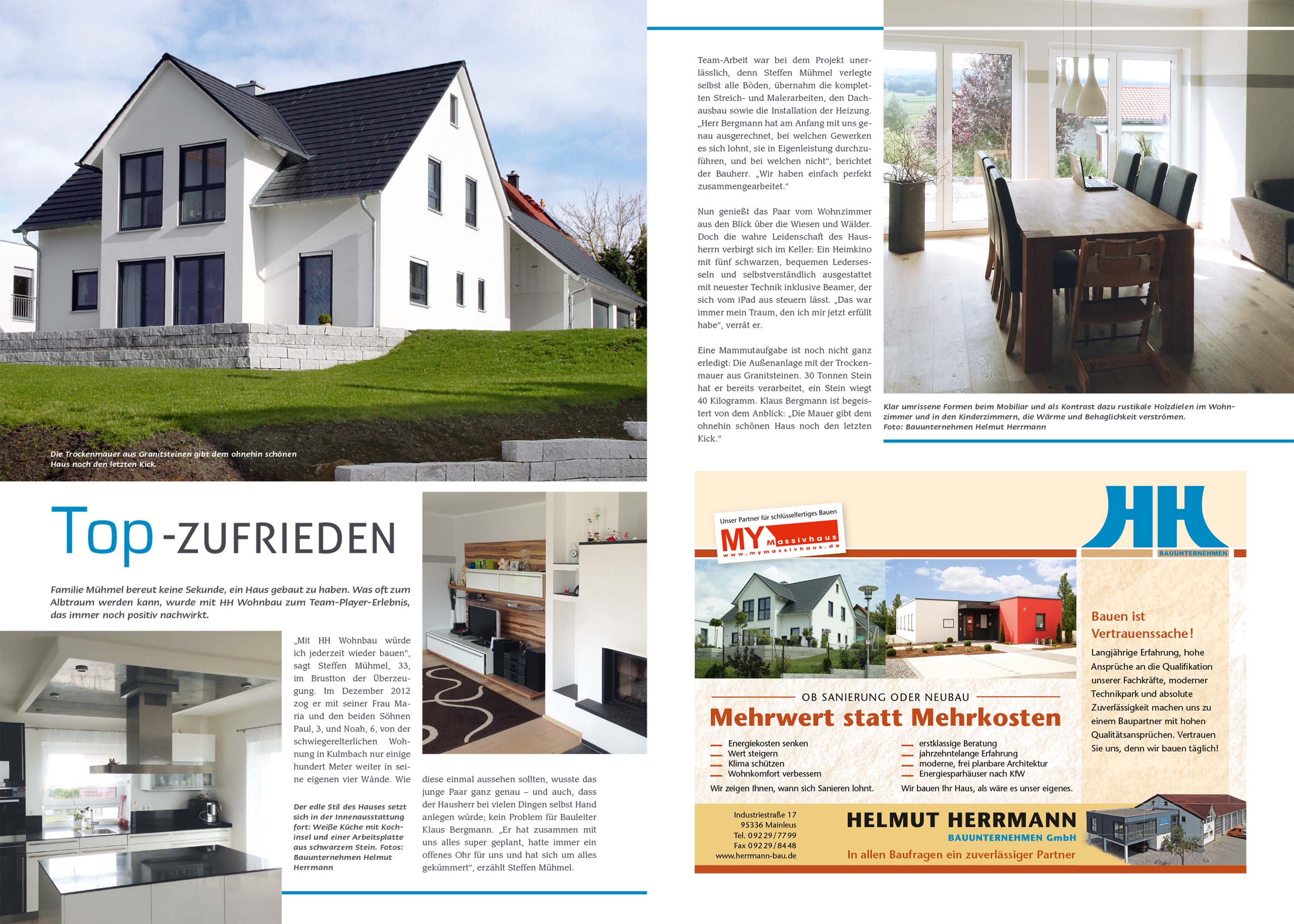 „Mit HH-Wohnbau würde ich jederzeit wieder bauen“, sagt Steffen Mühmel, 33, im Brustton der Überzeugung. Im Dezember 2012 zog er mit seiner Frau Maria und den beiden Söhnen Paul, 3, und Noah, 6, von der schwiegerelterlichen Wohnung in Kulmbach nur einige hundert Meter weiter in seine eigenen vier Wände …