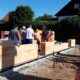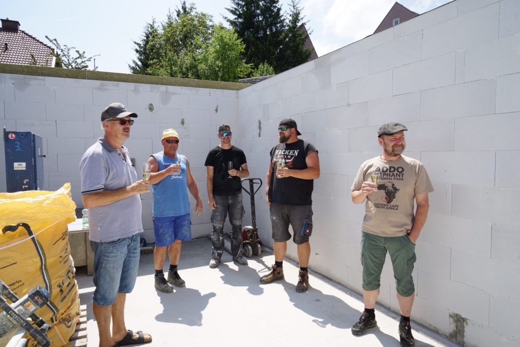 Mit Fertigstellung der Mauerarbeiten im Kellergeschoss lud Geschäftsführer und Bauleiter Klaus Bergmann zur gemeinsamen Grundsteinlegung.