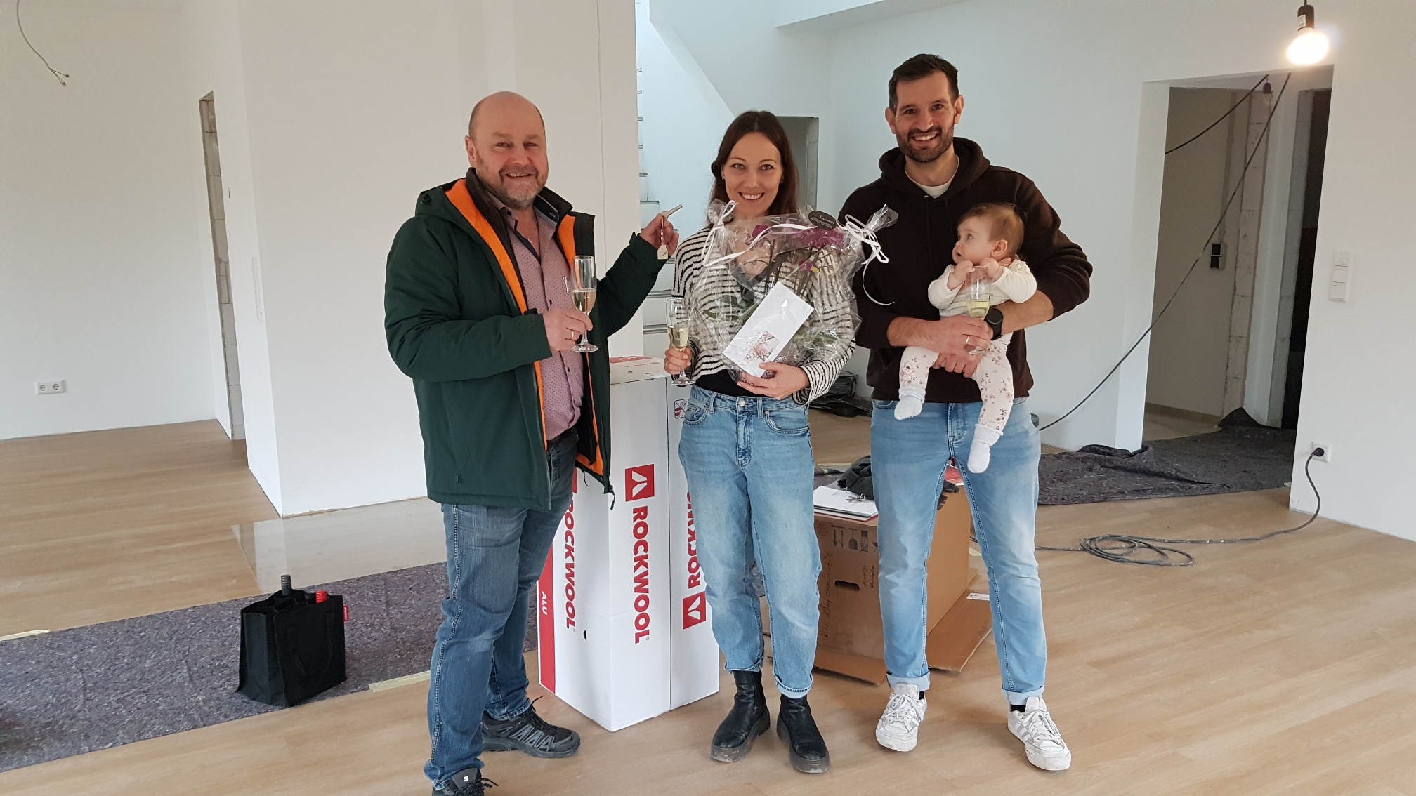 Ergänzend zu unserem Beitrag vom 04.04.2025 über den Spatenstich, konnten wir das Jahr 2025 noch mit einer Schlüsselübergabe abschließen. Als vorgezogenes Weihnachtsgeschenk erhielt die Familie Kirsch am 12. Dezember 2025 noch die Schlüssel für ihr schlüsselfertig gebautes Einfamilienhaus in Katschenreuth, Kulmbach. Fast genau ein Jahr nach der Vertragsunterzeichnung vom 04.12.2024 erfolgte die Schlüsselübergabe durch Geschäftsführer und Bauleiter Klaus Bergmann.